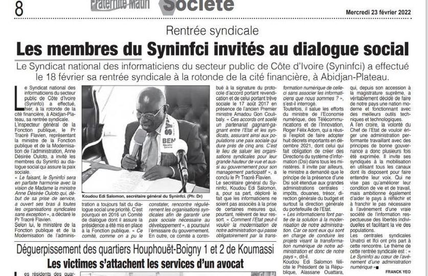 Le Syndicat Nationale des Informaticiens de la Fonction publique de Côte d’Ivoire (SYNINFCI) a tenu sa traditionnelle rentrée syndicale le 17 février 2022 à la Rotonde de la cité financière à Abidjan-Plateau. Placée sous le thème «SYNINFCI, acteur incontournable pour la réalisation de la vision de transformation numérique de notre Administration du Président de la République»